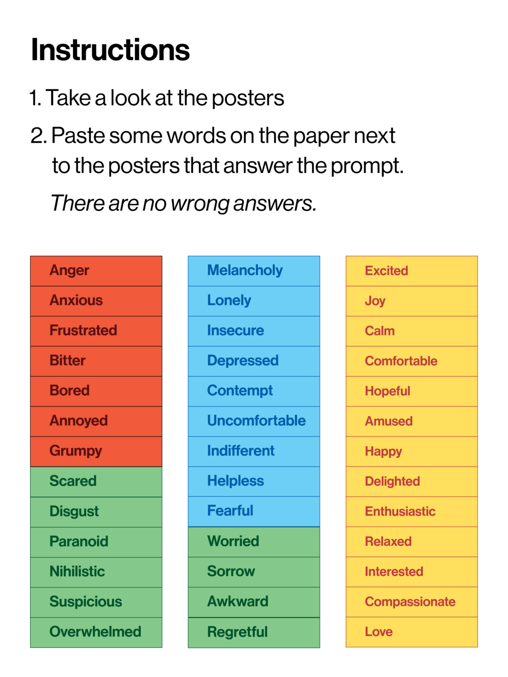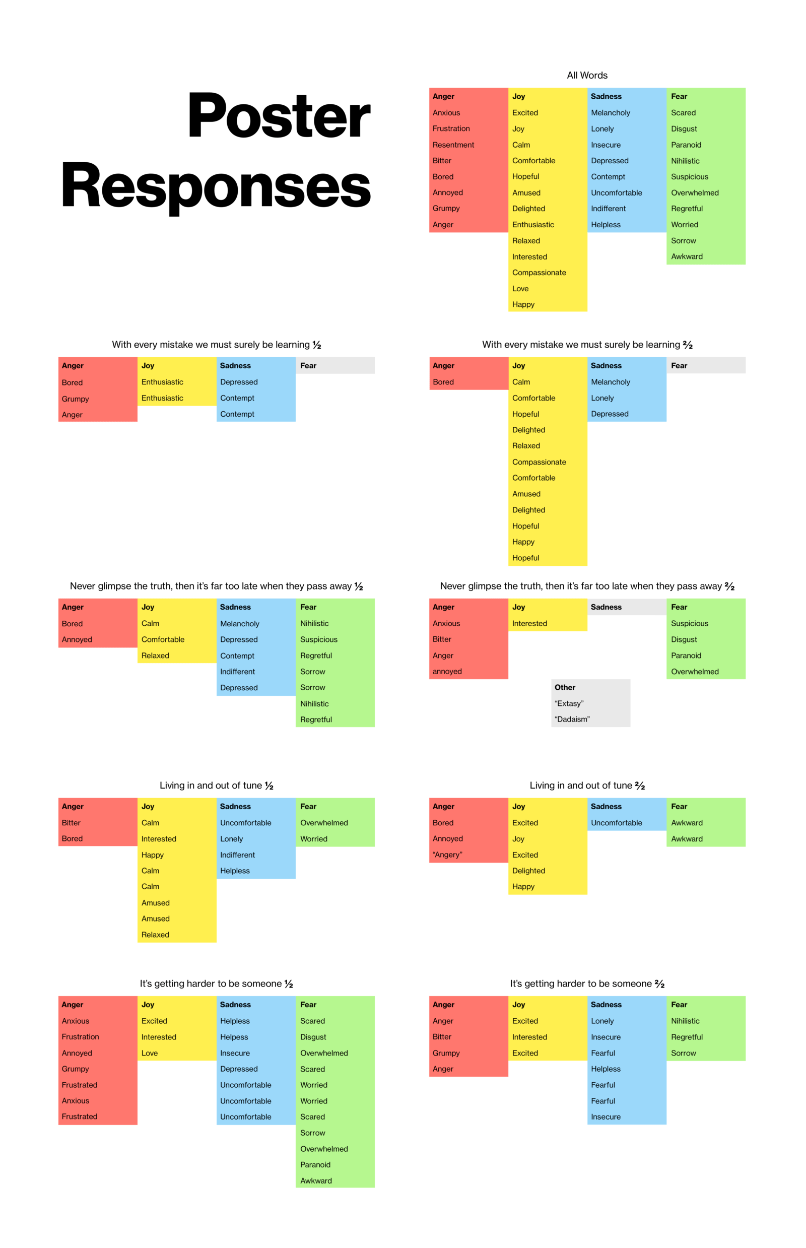 The main goal with the interactive component was to have a unique range of genuine subjective responses in a manner that was accessible for everyone, including the non-designer public that formed most of the crowd. Feeling-based noun stickers were chosen as a form of structured feedback in order to discourage the idea that there was one right “answer” to "solve" for each poster, to give an accessible avenue for non-designers to communicate and analyze design, and to discourage any focus on the peculiarities of the posters from a Graphic Design viewpoint.